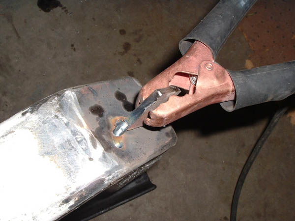Because the metal I was working with was largely painted, except where I was welding, I ran out of spots to clamp the ground to. I ended up taking a piece of 1/4" steel and tack welding it wherever was handy, in this case the cap from the 45° end.