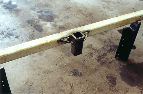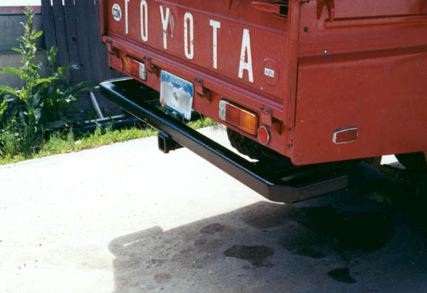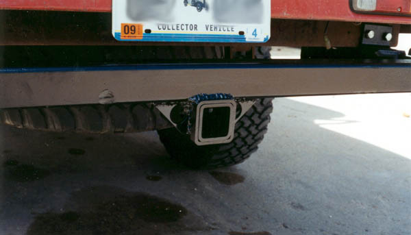 I picked up a receiver to weld on to this bumper. After measuring carefully several times, I welded it onto the center of the underside of the bumper. Then I fabricated some reinforcing plates out of 1/4" steel, and drilled holes in them to fasten the safety chain to. When it was ready for paint, this is what it looked like. I then put 2 coats of zero rust on every surface, and topped it off with a coat of Ace epoxy enamel.
