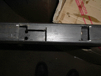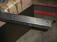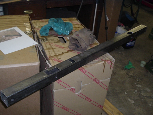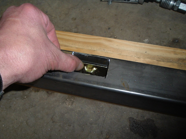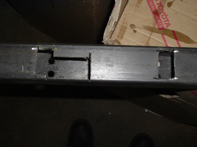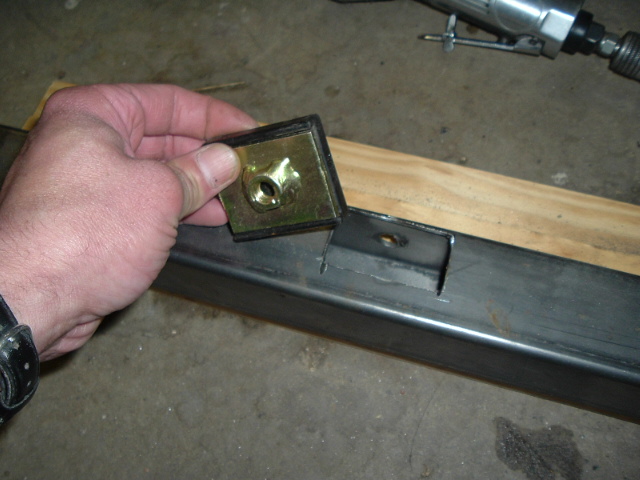 The stock design is a u-channel, open behind it so the body mounts can be accessed. Since this was 2x2 square tube, I had to cut rectangular openings for the two innermost body mounts. Here, I'm making sure the holes are big enough to get the body mounts inside.