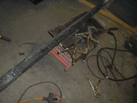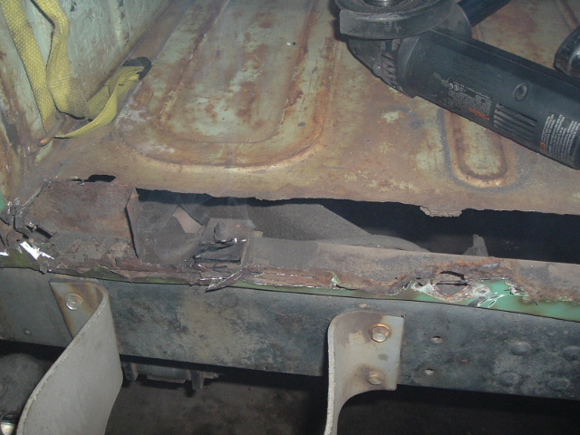 I had been thinking that this was going to be a one day job (yeahrightsure :-), and had been putting off taking the rig down. But at this point, I thought I was far enough along to go ahead and hack out the old sill. Between the grinder and the cutoff wheel, I chopped what was left. Even after soaking in liquid wrench, the old body mount bolts just twisted off, so I cut them. I guess 35 years worth of rust will do that to a lot of fasteners.