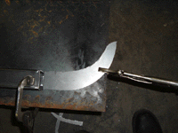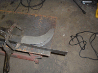 Since the "wings" of the sill were destroyed and the quarter panels over them were history, I had to make wings for my new sill. I used my CCOT rear channel on my nearby 76 as a template and cut out four pieces of 16 gauge sheet metal for the tops and bottoms of the wings. The second photo shows a completed piece being clamped for welding to the 2x2. The photo at the right shows where I cut some rectangular pieces to go on the outside, clamped, ready to start welding to the 2x2 and to the top and bottom pieces of the wings.