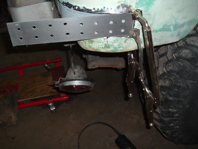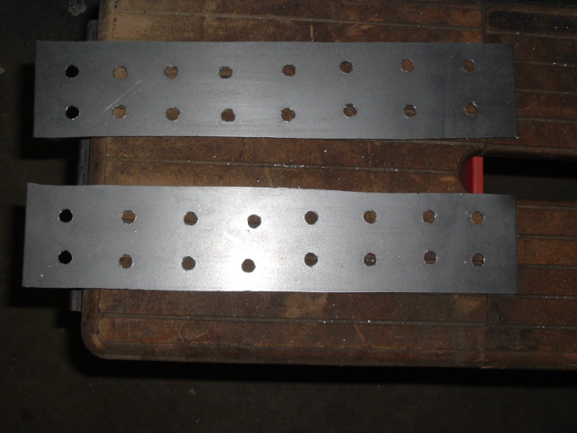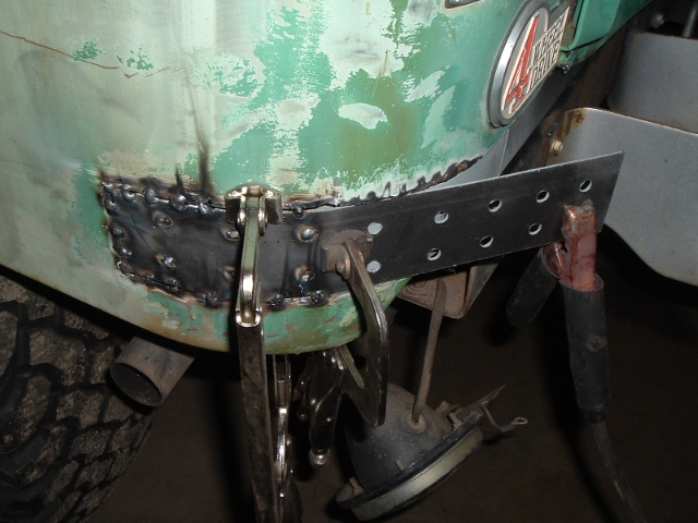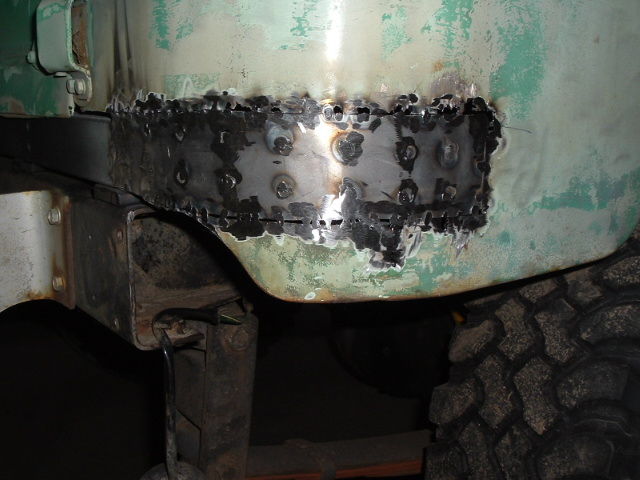 I had to replace the metal where I had cut out the rotted sections of quarter panel, so I fashioned a couple of rectangles out of 16 gauge sheet steel. The holes are to weld to the outer skin of the channel wings. By using holes like this, you can emulate the factory spot welds without having too much weld bead above the surface to have to grind down. It's a neat technique my buddies at the local body shop turned me on to.
