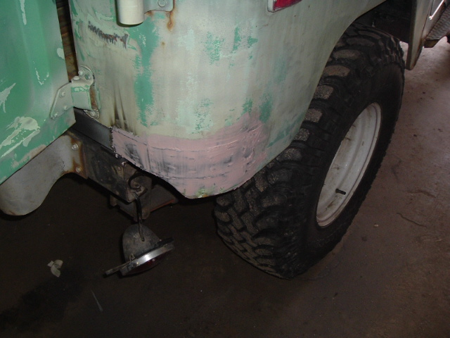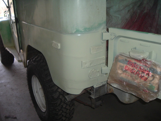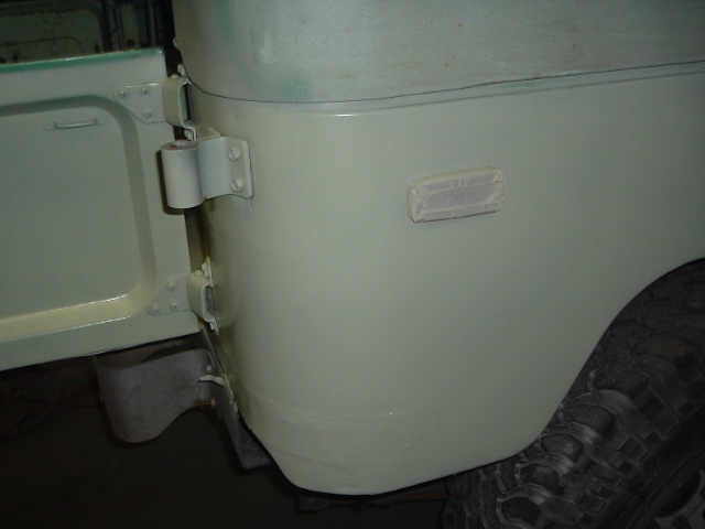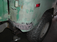 As mentioned, body filler is used to smooth over the welded seams. After the body filler is applied and allowed to harden, it is sanded, then reapplied and sanded again. I went with two layers, but should have used more if I had been more interested in appearance. As it ended up, you can tell where the wings and new skin are by discontinuities in the appearance of the painted quarter panels, but this is a trail truck, not a pristine restoration.