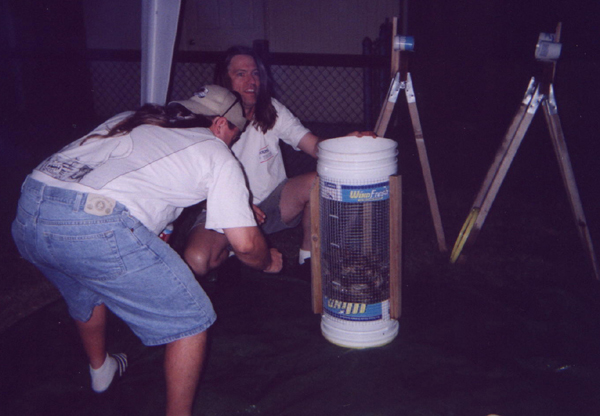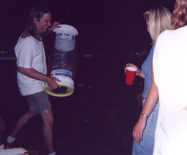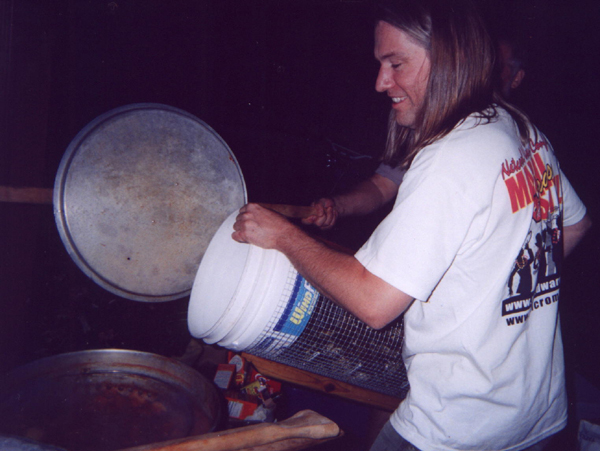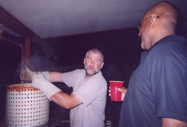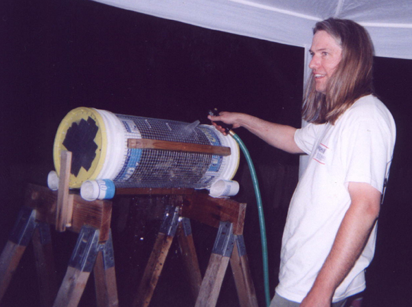 First they soak (one batch at a time) the crawdads in salt water. This purges them. After that, they hose off all the yuckies. This is a photo of Tom hosing them off in a contraption that Mark made.