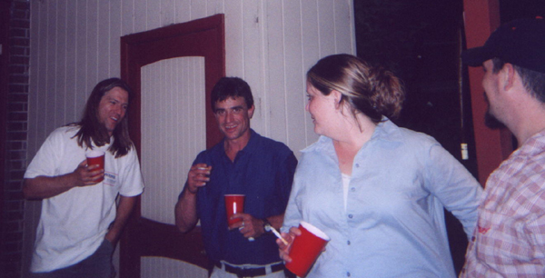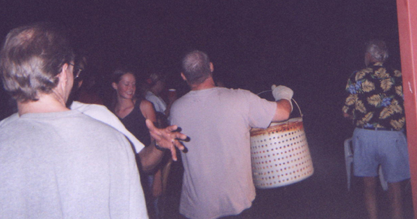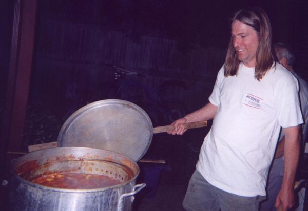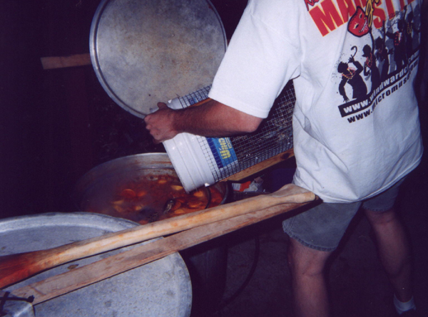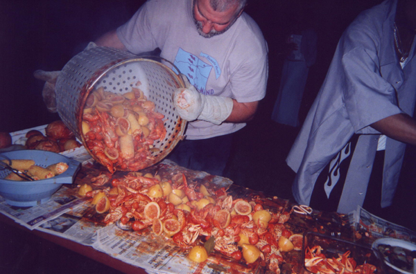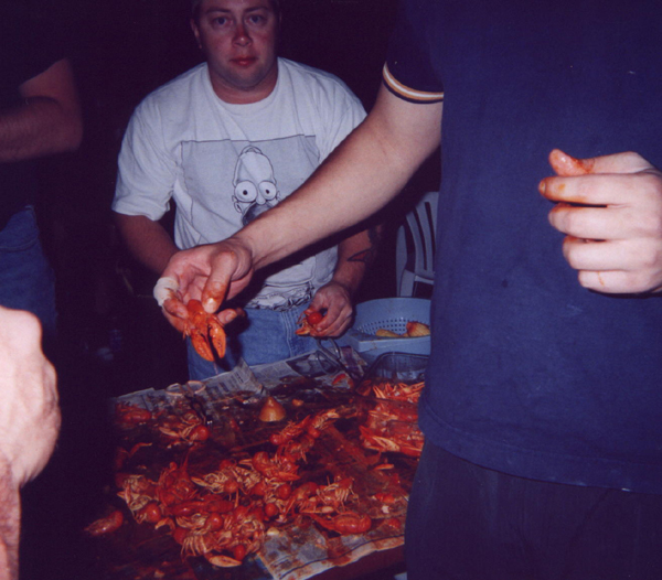 I'll try to describe the process, but there are lots of details and stuff, I learn more every year. First they bring the live crawdads home in great big coolers. They get a whole bunch of stuff to prepare the crawdads and cook everything. They get a couple of huge pots to go on huge propane burners. To the water to boil them, they add gallons (literally!) of hot sauce, pounds and pounds of cayenne pepper, bushels of cut up lemons. There's probably more too, like bay leaves and stuff. Besides crawdads, they also throw in a bunch of potatoes and corn on the cob, Louisiana style.