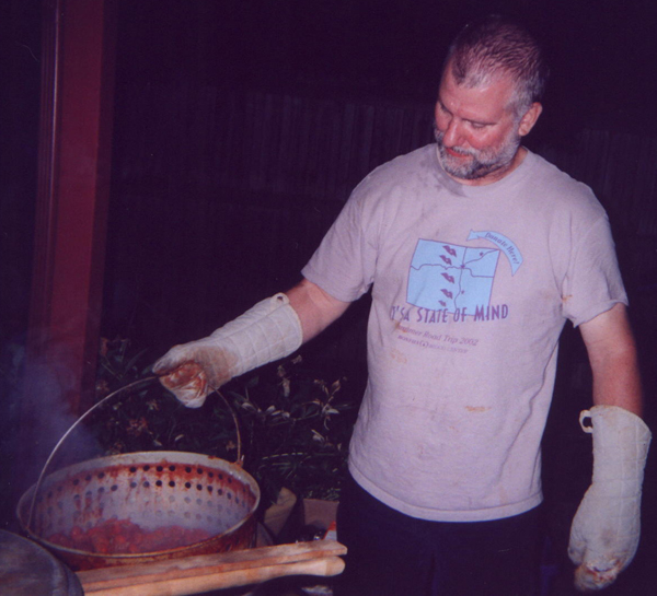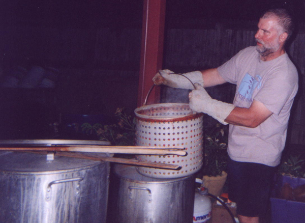 The other batch is just about ready. When the lid is lifted the wonderful smell fills the backyard! You can see that inside each pot is a perforated liner. This will be used to lift them out.