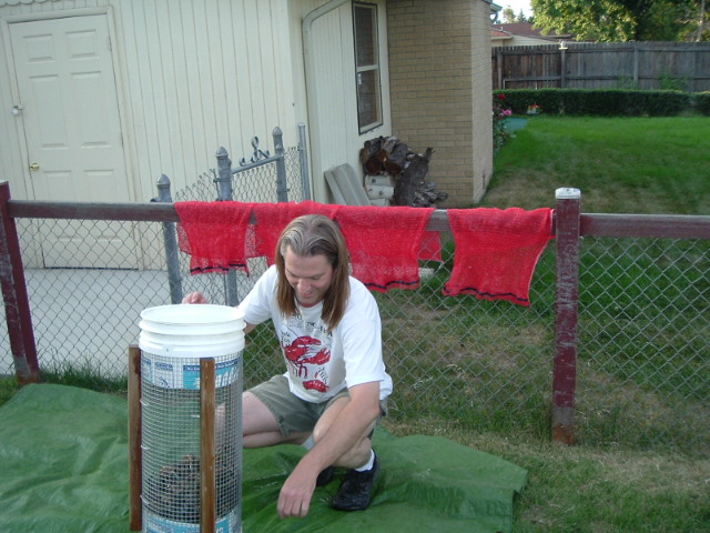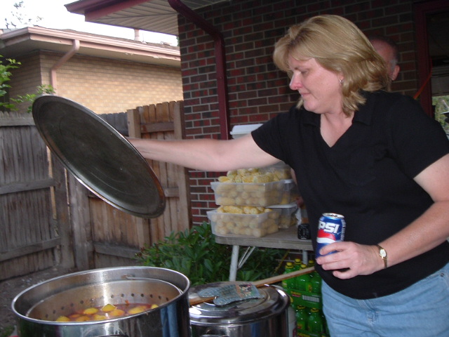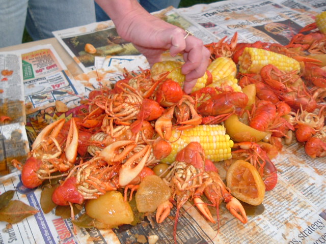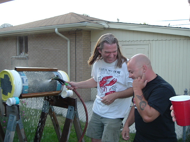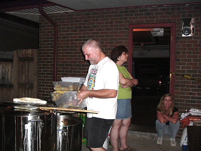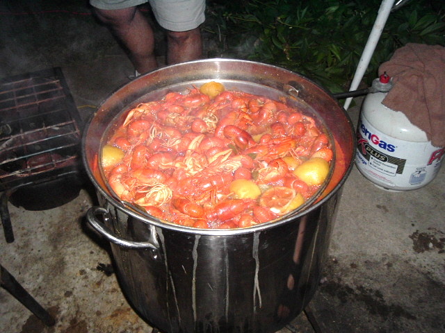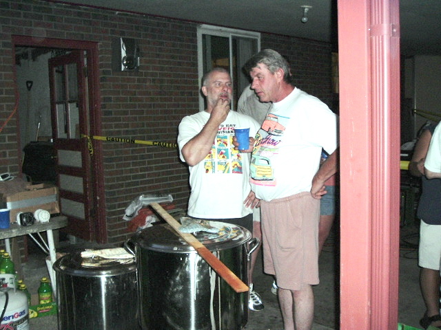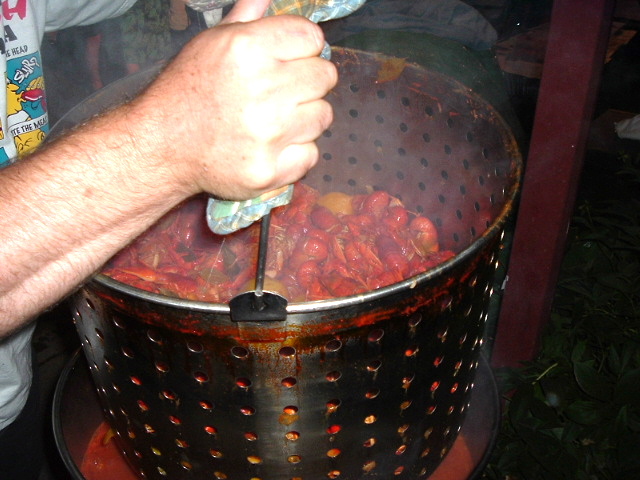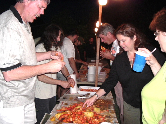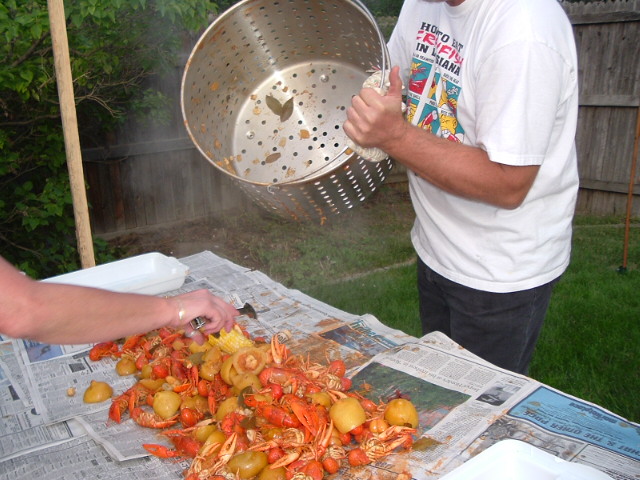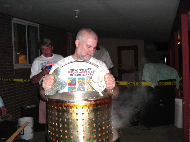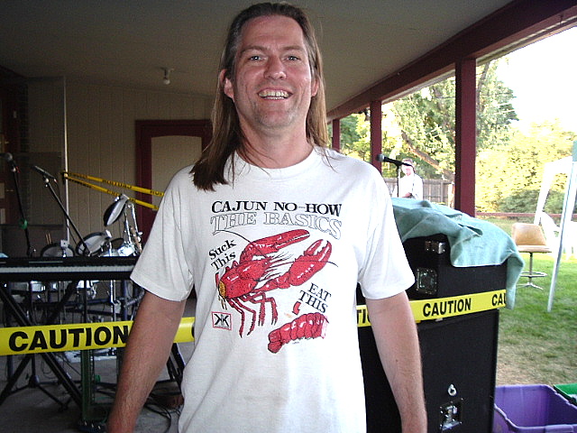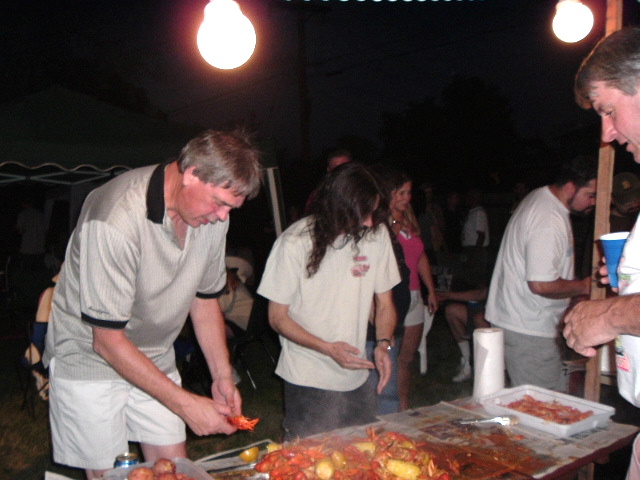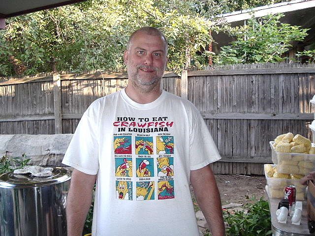 As always, Tom and Mark put on a heck of a party. They bust ass catching them and preparing them for us to enjoy, turning all us land locked Coloradans on to Cajun style hospitality. Below, Mark sports a new shirt for the occasion, and in the background you can see the new cauldrons they got for this year's bash. The first Saturday in August is the family oriented version, and the second Saturday is adults-only kegger. Naturally, this is the kegger!