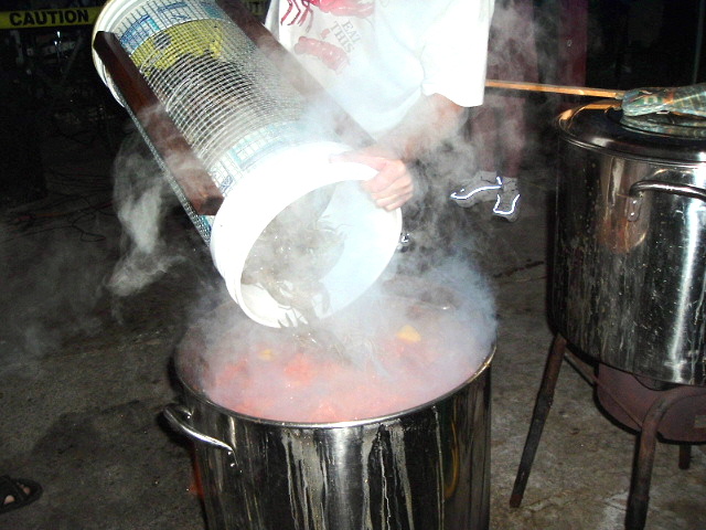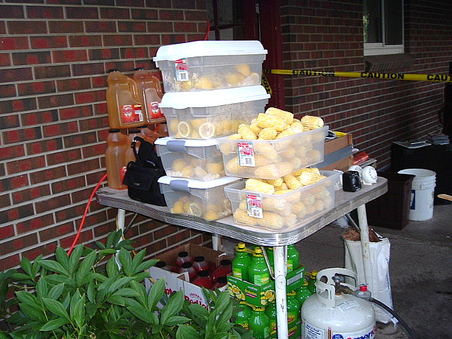 Here you can see some of the supplies they've laid in. We have corn on the cob up the gazoo, lemons up the gazoo, cayanne pepper, lemon juice, hot sauce, bay leaves and more. It takes a lot tp put this thing on, hats off to Mark and Tom for all their hard work!